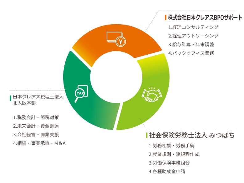 社労士法人みつばちでは、人事労務分野に留まらず貴社をサポートできます。 日本クレアス税理士法人北大阪本部と密接な協力関係にあり、経理・給与・労務・会計・税金・資金調達などのそれぞれの分野でプロフェッショナルがお手伝いできるからです。企業の発展に必要となる業務を万全な体制で構築できる理由がそこにあります。